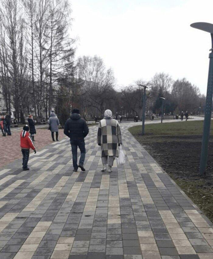 The pictures posted on Imgur also show a woman wearing a blouse that matches a hotel hallway, a dogtooth-print coat that fits a chair, and a piece of clothing that lets its wearer blend in next to a flowering tree.